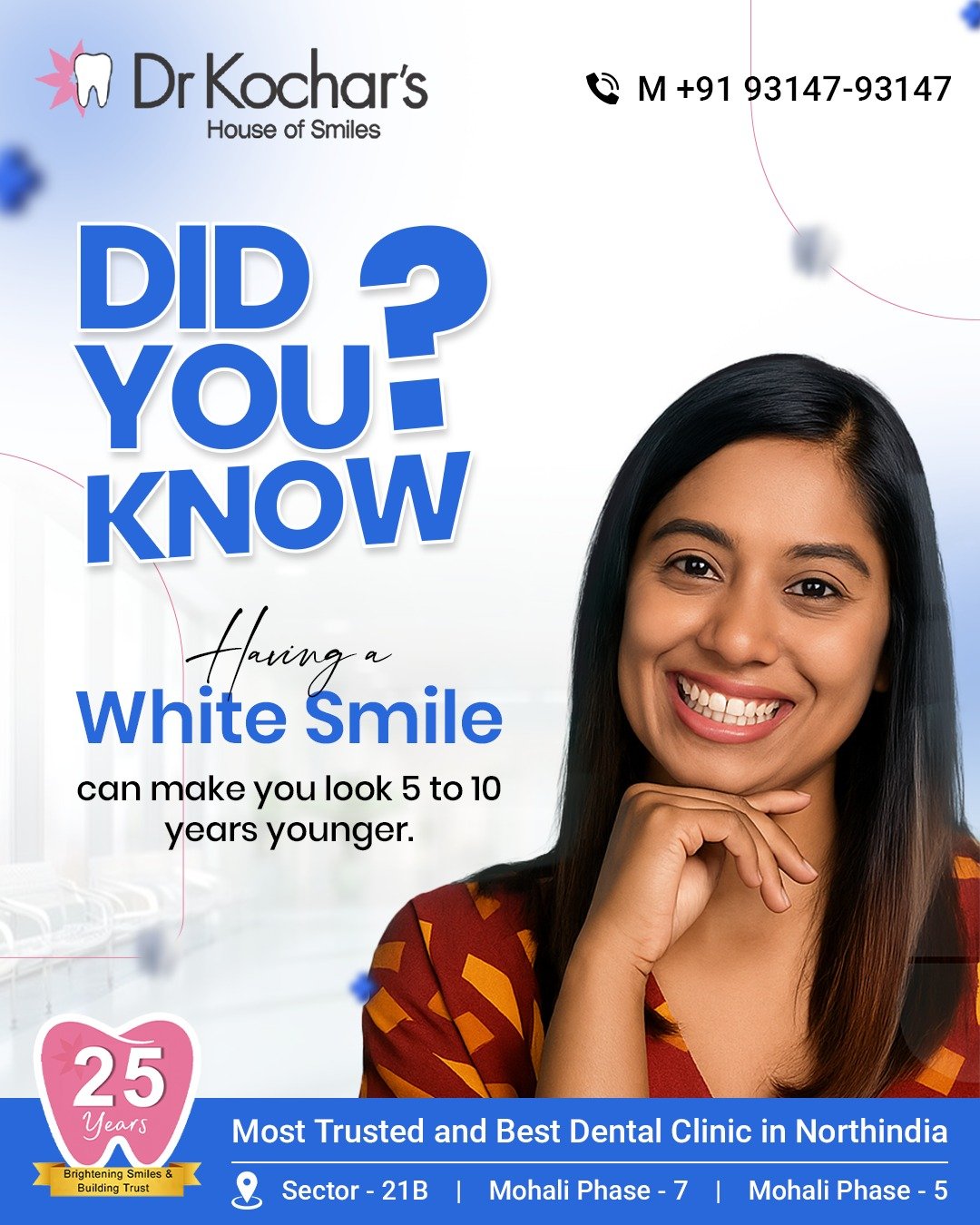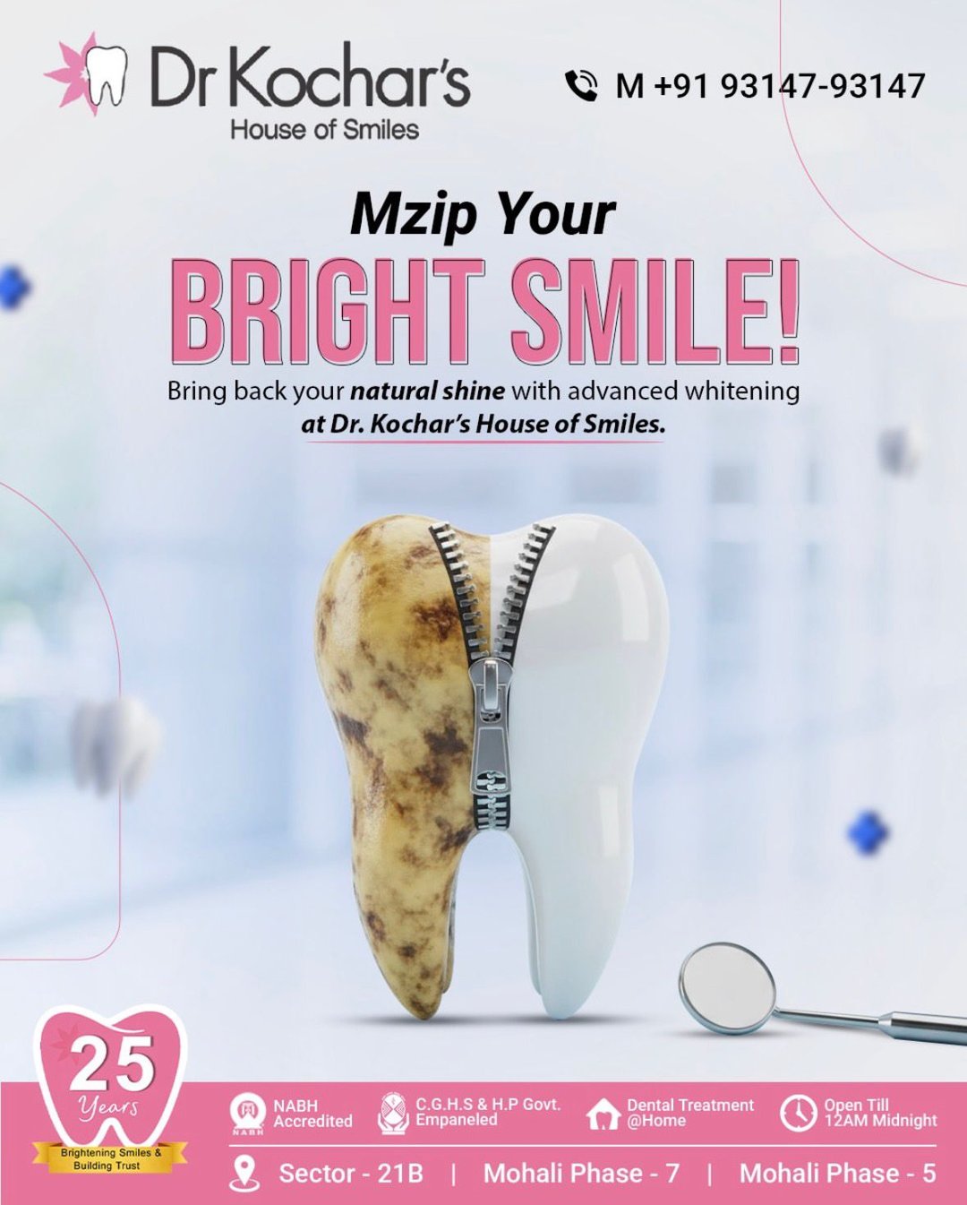 Dr. Kochar's House of Smiles, proudly standing as the top dental clinic in the heart of Chandigarh since 2000, welcomes you into a world of pristine dental care. Located conveniently in Sector 21B, our clinic is the vanguard of dentistry, consistently surpassing expectations. With an unwavering commitment to safety, hygiene, and excellence, we provide comprehensive dental treatments from general dentistry to intricate procedures like dental implants and wisdom tooth extraction. Experience the magic of our expert team, utilizing state-of-the-art technology and gentle, minimally invasive techniques to craft mesmerizing smiles.